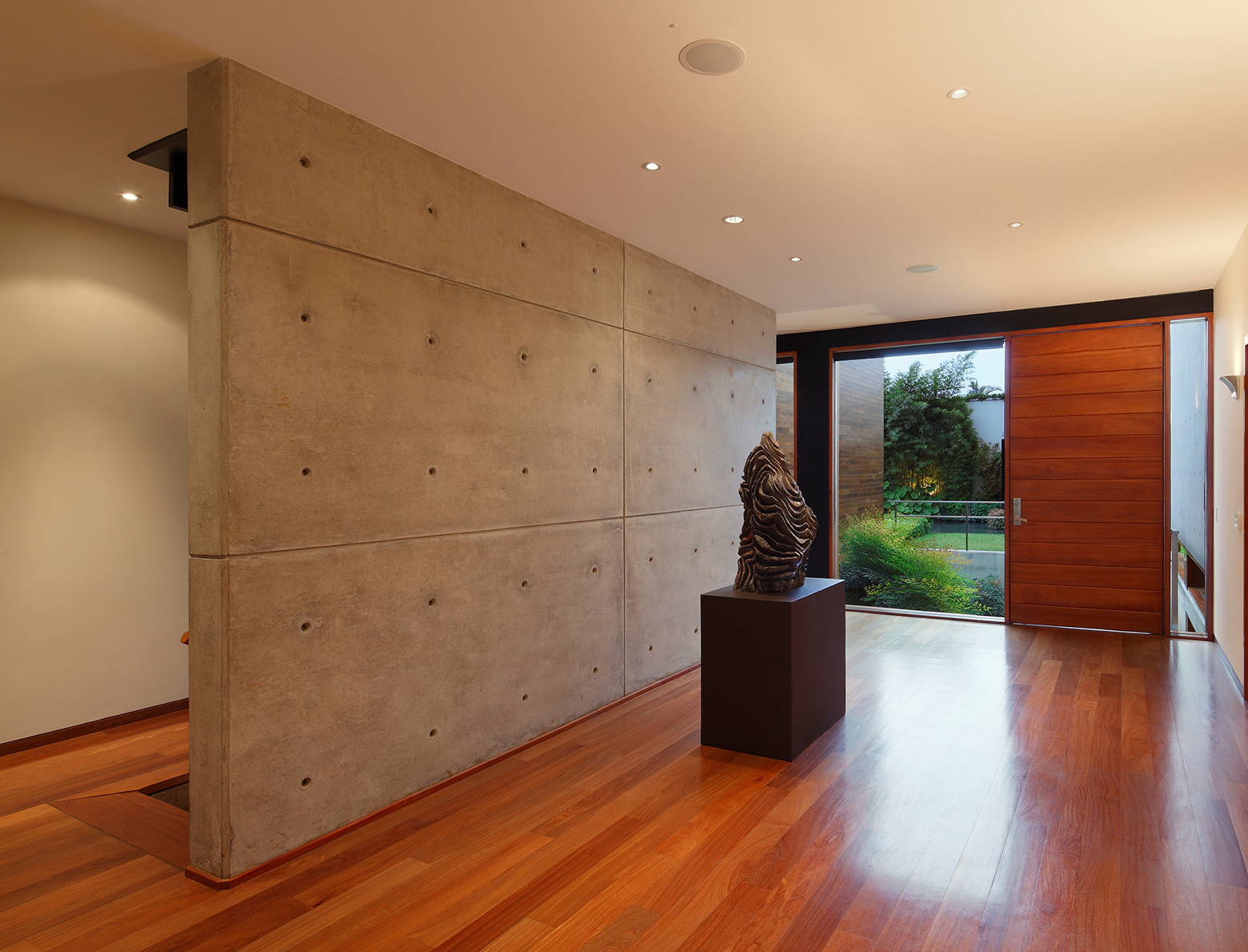 The access to the house is through a bridge over a sunken garden that works as a moat and transitional space between the exterior and the interior at the same time that becomes a light source for underground studio and living areas while emphasizing the entry way hierarchy.
