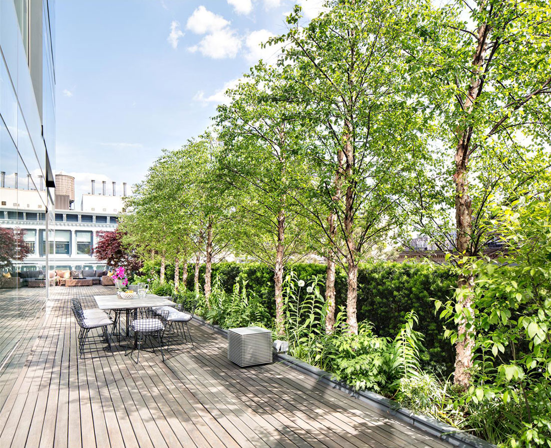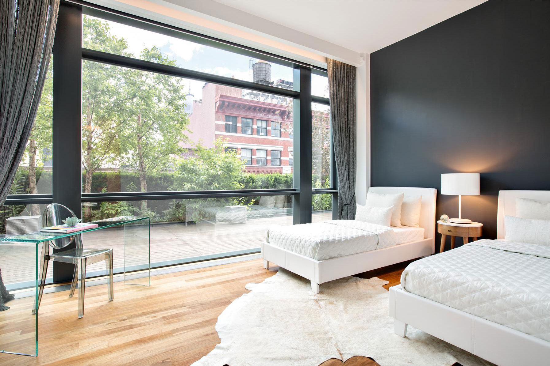 This penthouse — clearly the crown jewel of starchitect Jean Nouvel’s SoHo masterpiece at 40 Mercer — presents one with over 4500 square feet of grand living space, 1500 of which is allocated to the carefully crafted wrap-around terrace and 3000 of which is apportioned to the generous interior. Set against the backdrop of historic, landmarked SoHo, the terrace features a private fresh-water pool and lavish landscaping of pristine hedges, shrubbery, perennials and a collection of trees so vibrant, any lover of the outdoors, fresh air, and sweeping vistas will be sure to appreciate it. Awash in light, which streams through every inch of the 12’+ floor to ceiling windows, the apartment is imbued with a sense of universal, open-ended tranquility and warmth.