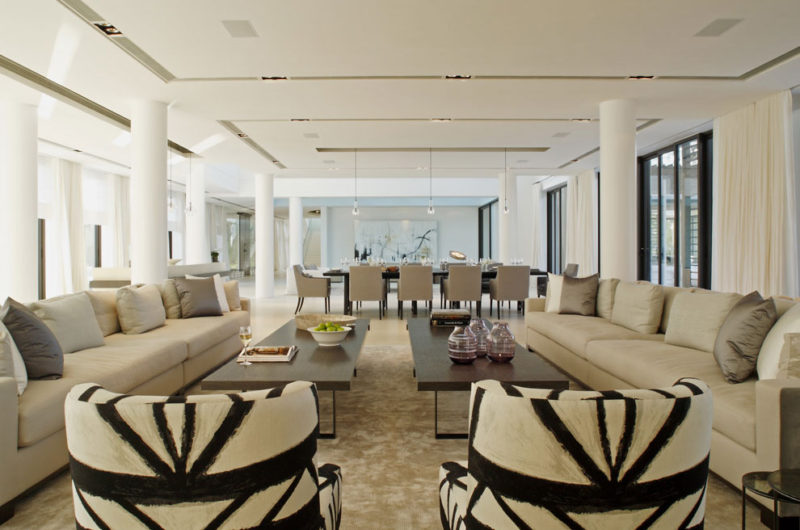Characterized by sophistication and elegance, the interiors were designed by Debbie Oppenheimer, a interior designer based in Hong Kong. Bespoke furnishings and specially commissioned works of art make every space unique and harmonious. Minimalism is at the core of the entire villa, starting with its seven en-suite bedrooms and continuing with all the other rooms. Amenities include a gym, movie theater room, and a spacious kitchen with state-of-the-art fittings.
