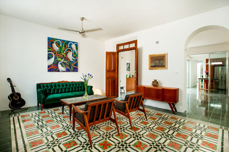 All exterior walls and pool are finished with polished white cement prepared with “chucum” water, a traditional technique used in the area that creates an impermeable surface with greater durability without paint, while inside we respect the traditional materials, which in some cases were reinterpreted with a more contemporary aesthetic. Such is the case of the mosaic cement floors. The existing ones were reused in the first corridor, and on the rest of the ground floor they were changed by the same kind of flooring but with a solid color. Upstairs we used wood floors (bamboo inside and Dzalam outside) to reinforce the idea of the Tree House.