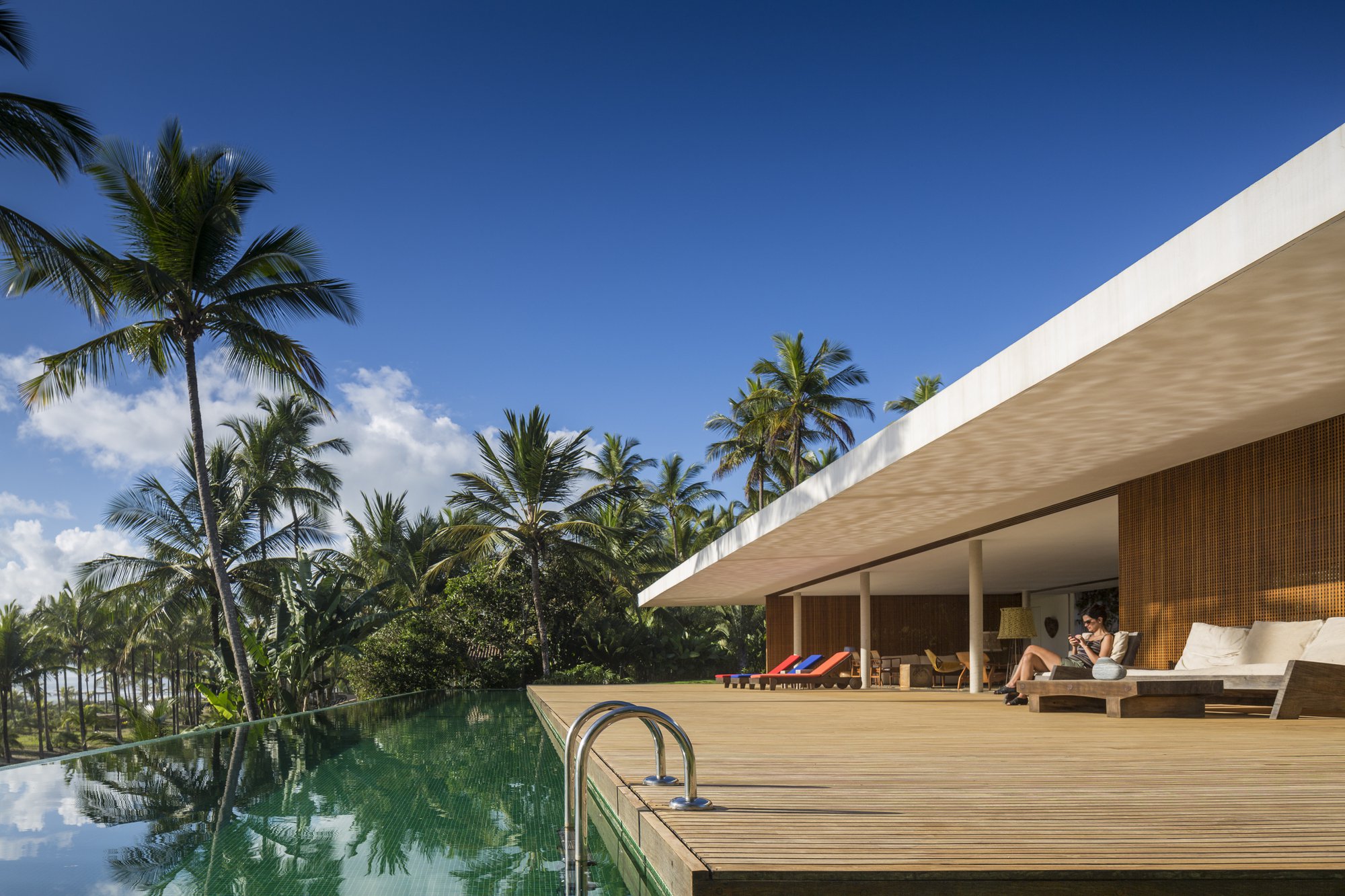 The bathrooms extend outside of the roof and are all opened to the outside, having their own individual gardens defined by walls, like patios. The doors in front of the rooms look out to a generous 2.5m-wide veranda where the hammocks rest on the recycled wood roof. The mashrabiya doors – a wooden latticed element, traditional in modern and colonial Brazilian architecture – shade the interior of the bedrooms, allowing the breeze to pass; and they can remain completely open for complete control of the interior light.
