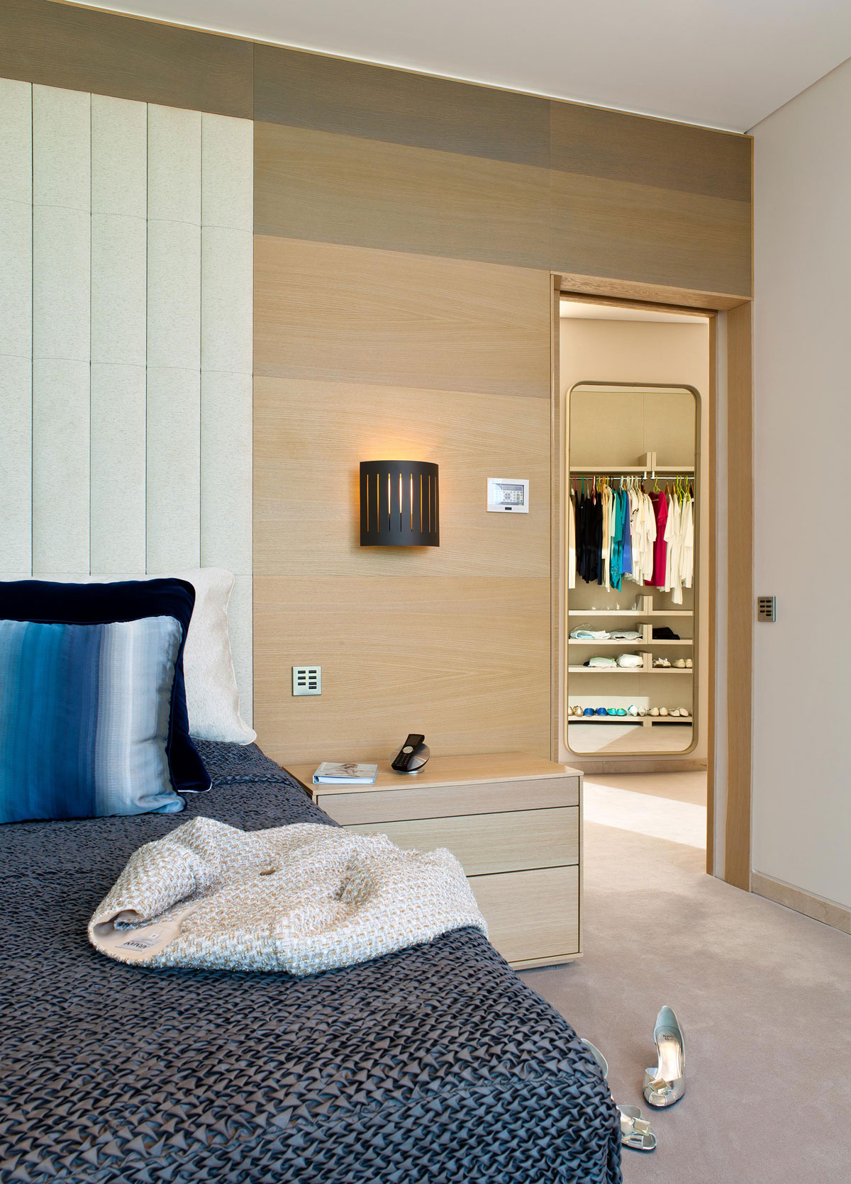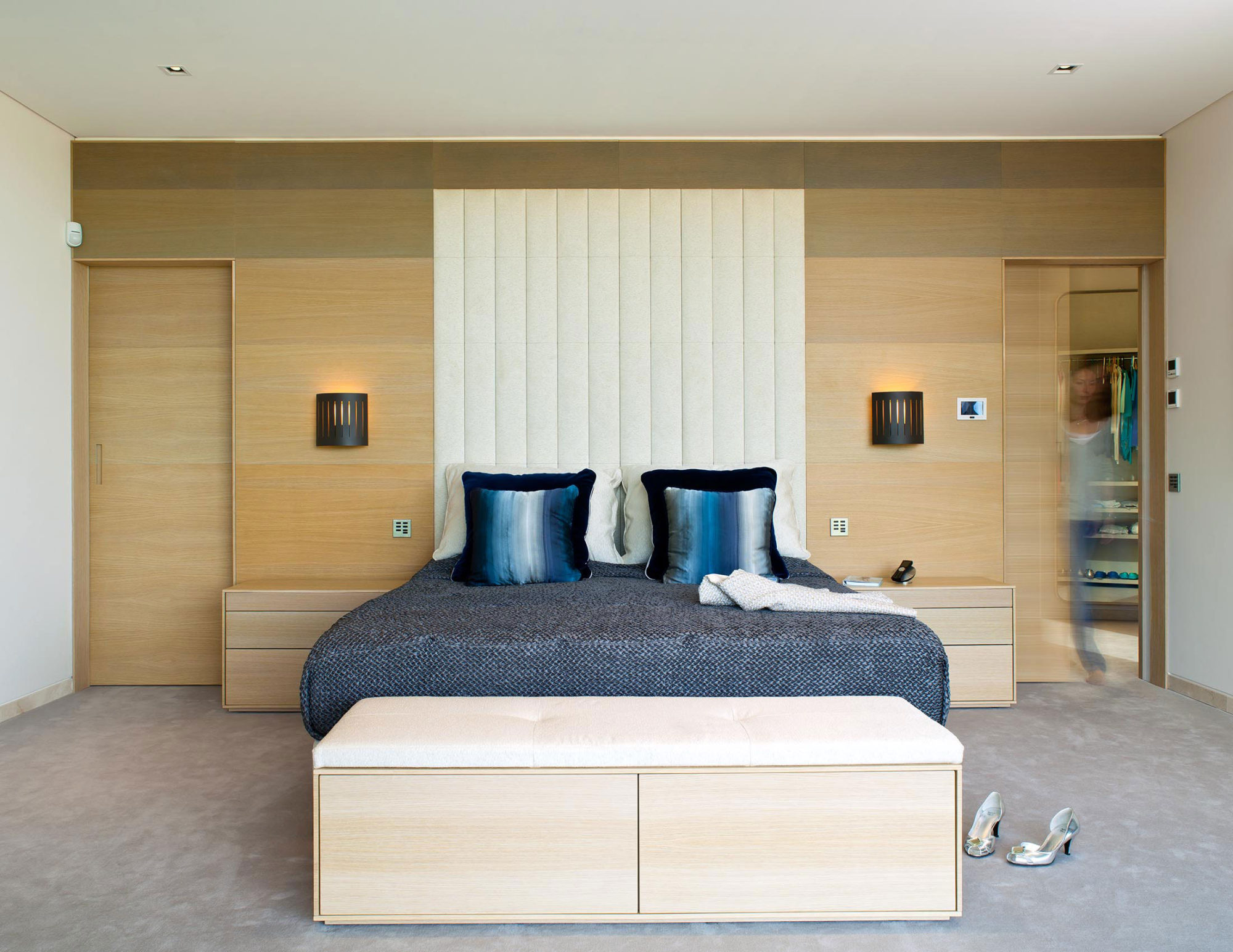 The kitchen is equipped with state-of-the-art appliances and boasts an oval-shaped dining table that can seat 5 people. The master bedroom impresses with its own walk-in closet, a large, comfortable bed and 2 wooden nightstands.