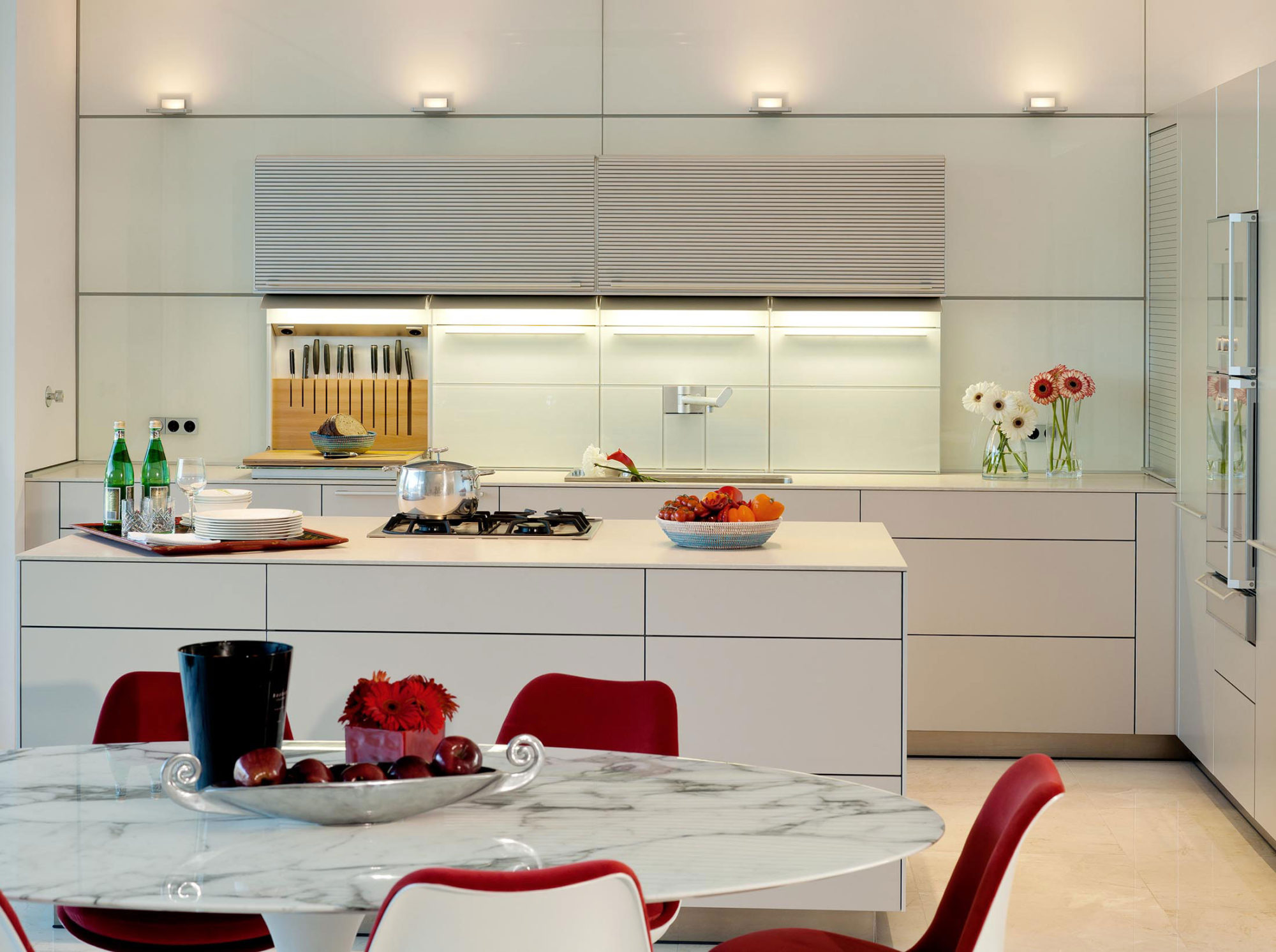 The interior arrangements involve crisp white walls as well as colorful décor elements in the form of paintings and natural plants. The furniture pieces are modern and elegant, while the lighting systems are integrated masterfully into the ceilings and into the outdoor decks.